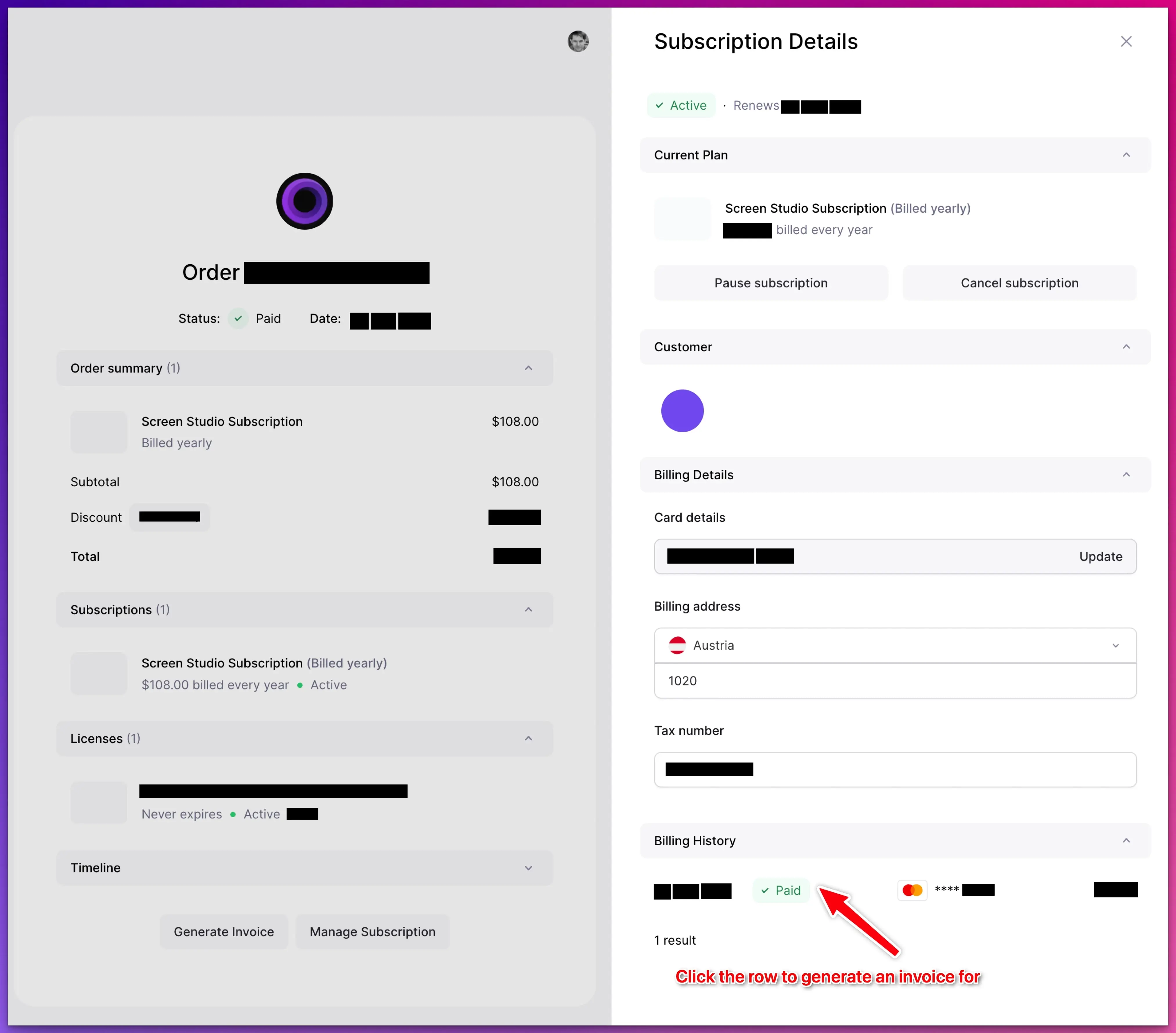 LemonSqueezy allows customers to generate invoices for orders and subscription payments. Customers can generate invoices through the “My Orders” page in the customer portal, specifically within the billing history section for subscription payments.